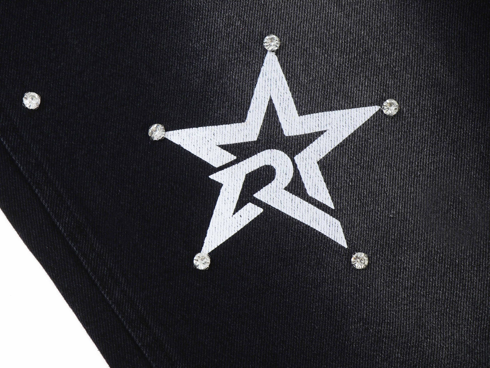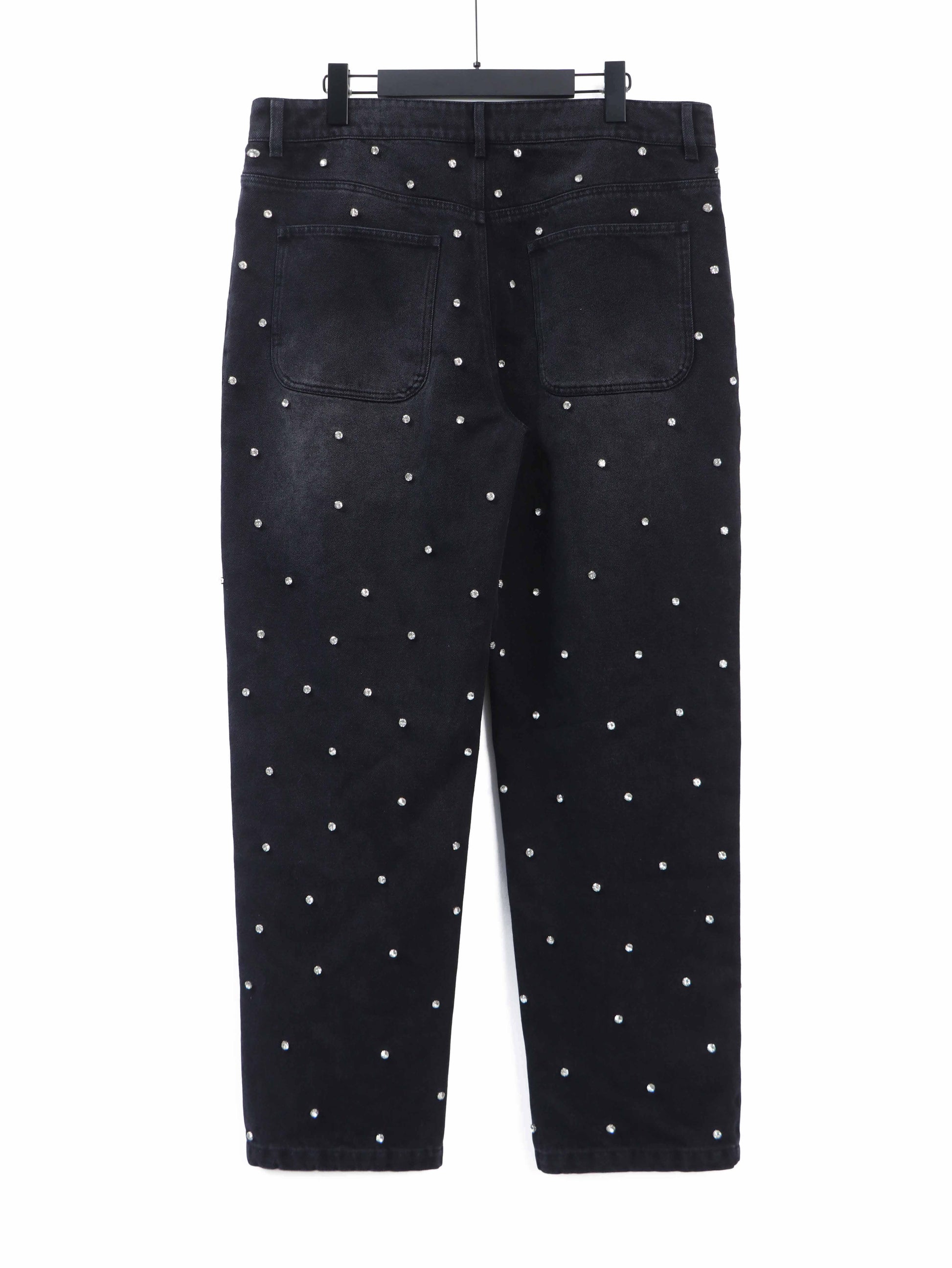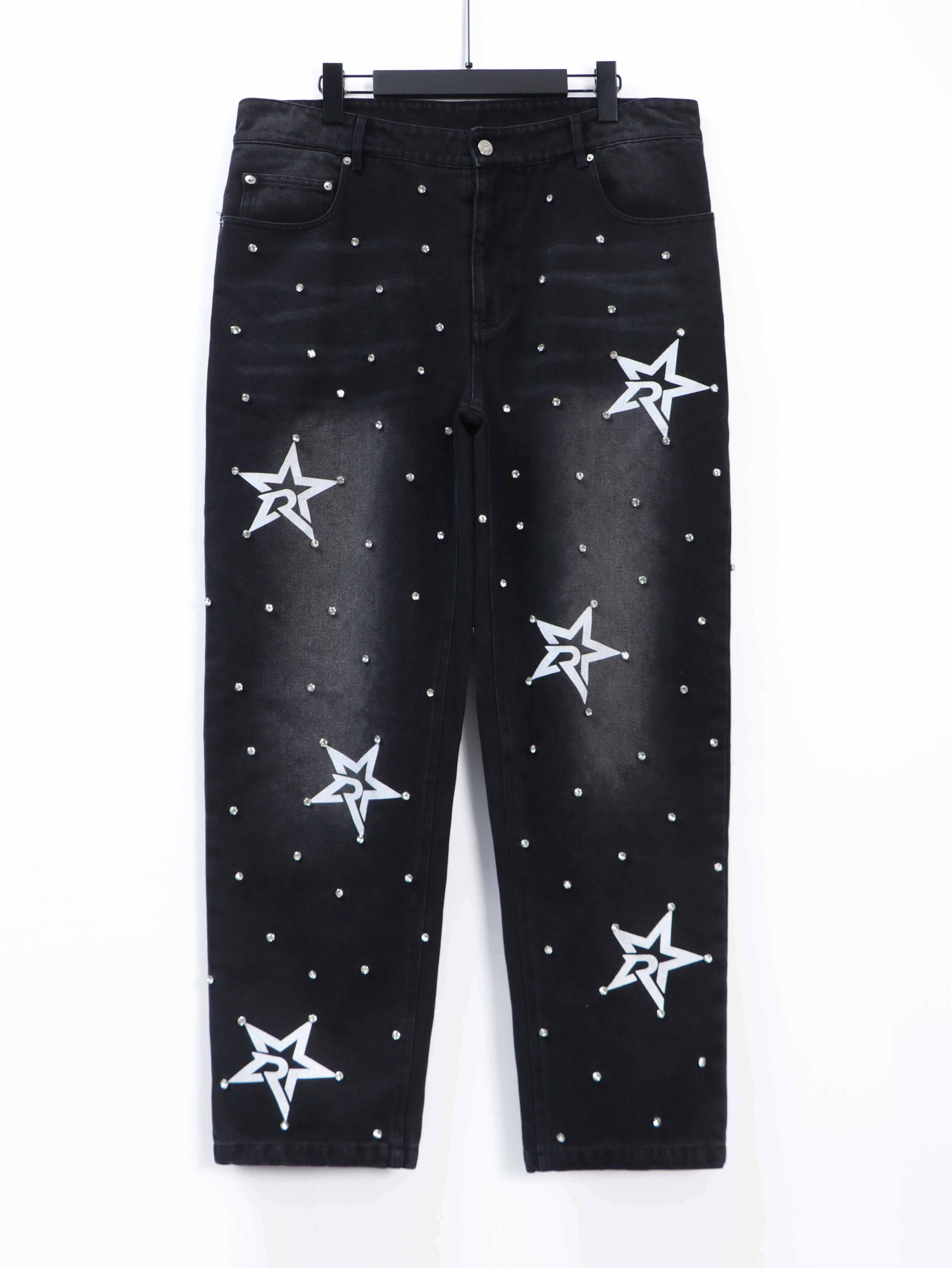 Black jeans with screen print logo, rhinestone decorated.