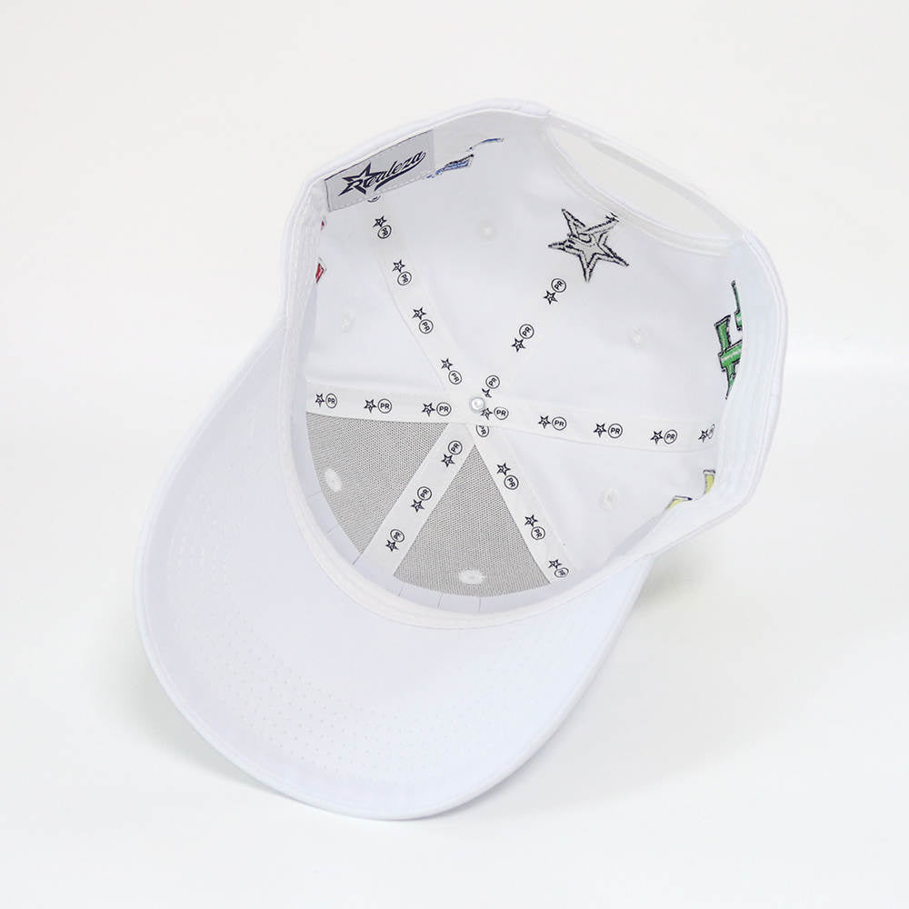 White cap with multiple embroidery. Black PR in 3D on front multiple colors flat embroidery.